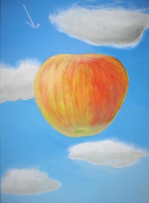 Bon, histoire donc de faire quelque chose avec cet essai r�ussi de ciel nuageux, et de profiter d'un cours "sp�cial pommes" du samedi apr�s-midi, Brigitte imagine d'y poser une pomme, fa�on Magritte. Avouons qu'en premier lieu, et � cause de ce nuage particuli�rement gris du haut, elle avait pens� un moment d'y faire flotter une douchette... et puis voil�, �clair de g�nie : |
