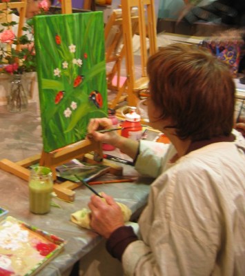 Ce travail sur les coccinelles, à l'origine un exercice de maniement des pinceaux pour faire de longues trainées homogènes (brins d'herbes). On a improvisé, et ce qui était au début un essai est devenu un charmant tableau. La coccinelle sera le thème utilisé par Claudine pour sa parabole, le grand projet de la saison à l'Atelier du Pommier ! |