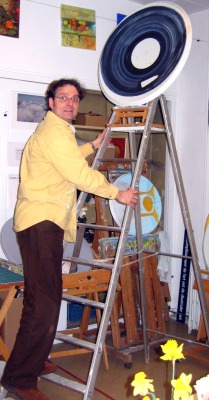 Maintenant, c'est parti pour de bon, sur des paraboles préparées spécialement pour nous en ateliers de carrossiers et garages locaux (Citroën à Gisors et Paul à Bordeaux-Saint Clair) pour permettre un meilleur accrochage de la peinture acrylique. En cours de route, autres essais encore, de plus en plus haut. A suivre..... |