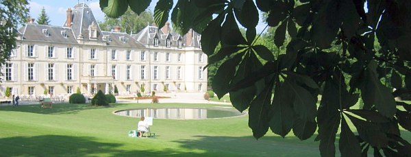 (ci-contre, gauche) Sylvie se livre avec fougue à d'épiques batailles avec ses pinceaux. Elle est visiblement passionnée. Toute entière à son aventure picturale du moment, le temps suspend son vol, dans le parc du château d'Aveny (voir la peinture du pont d'aveny)