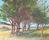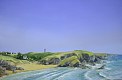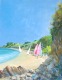 Du 1 au 18 juillet 2004, nous étions à Tibain, commune de Locmaria. Au contraire de l'année dernière, où ma palette se satura de bleu presque méditérranéen, cette année plutôt grisaille, bruine, vent... j'ai quand même pas mal travaillé sous le parapluie, aux bord des routes, et mon point de chute favori, vers les 19h, était le café et l'église de Locmaria, celle-ci très insolite avec son palmier, son toit en poivrière, son ambiance espagnole ! Les touristes planqués dans leurs logis, je rencontre avec plaisir les vrais belle-ilois, en vélo, à pied, à cheval... et aux comptoirs... |