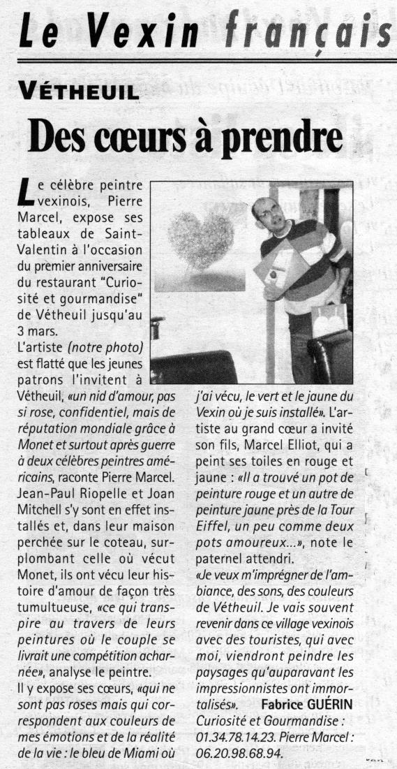 DES CŒURS A PRENDRE Le célèbre peintre vexinois, Pierre Marcel, expose ses tableaux de Saint-Valentin à l’occasion du premier anniversaire du restaurant « Curiosité et gourmandise » de Vétheuil jusqu’au 3 mars. L’artiste (notre photo) est flatté que les jeunes patrons l’invitent à Vétheuil , « un nid d’amour, pas si rose, confidentiel, mais de réputation mondiale grâce à Monet et après guerre à deux célèbres peintres, une américaine et un canadien» , raconte Pierre Marcel. Jean-Paul Riopelle et Joan Mitchell s’y sont en effet installés et, dans leur maison perchée sur le coteau, surplombant celle où vécut Monet, ils ont vécu leur histoires d’amour de façon très tumultueuse, « ce qui transpire au travers de leurs peintures où le couple se livrait une compétition acharnée », analyse le peintre. Il expose ses œuvres, « qui ne sont pas roses mais qui correspondent aux couleurs de mes émotions et de la réalité de la vie : le bleu de Miami où j’ai vécu, le vert et le jaune du Vexin où je suis installé ». L’artiste au grand cœur a invité son fils, Marcel Elliot, qui a peint ses toiles en rouge et jaune : « Il a trouvé un pot de peinture rouge et un autre de peinture jaune près de la Tour Eiffel, un peu comme deux pots amoureux… », note le paternel attendri. « Je veux m’imprégner de l’ambiance, des sons, des couleurs de Vétheuil. Je vais souvent revenir dans ce village vexinois avec des touristes, qui avec moi, viendront peindre les paysages qu’auparavant les impressionnistes ont immortalisés ». FABRICE GUERIN Curiosité et gourmandise : 01.34.78.14.23 Pierre Marcel : 06.20.98.68.94